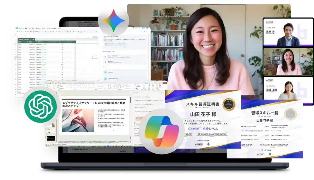 動画編集やデザインの様にポートフォリオをとして見える形になりにくいAI活用スキルだからこそスキル証明書で転職・副業のキャリア形成を優位に進めることができます。
