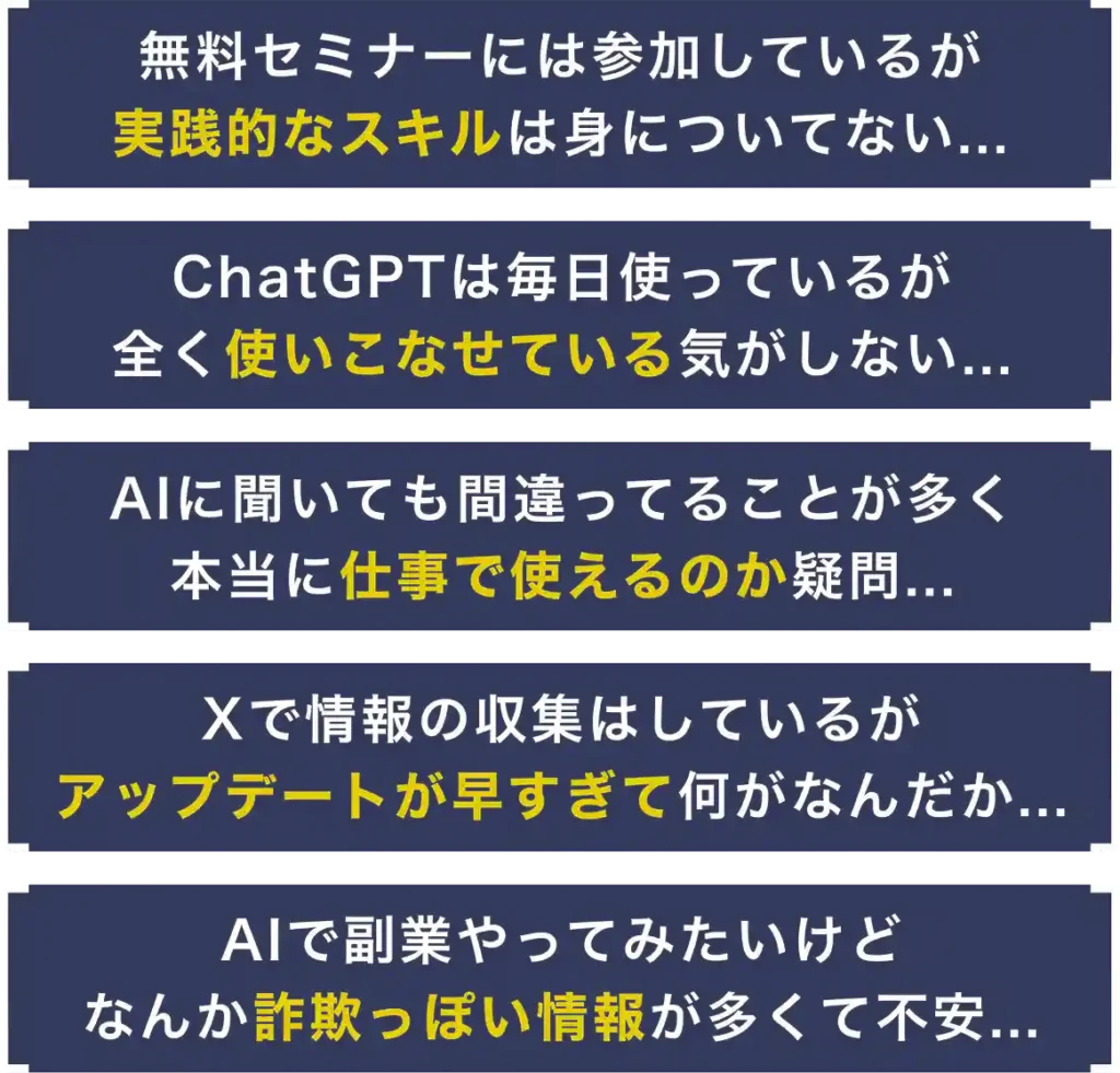 結局、学んだ内容を真似して試してみても、自分の課題を解決するための実践的な活用力は身につかず、いつまでもAIを使いこなせない状態に陥ってしまいます。