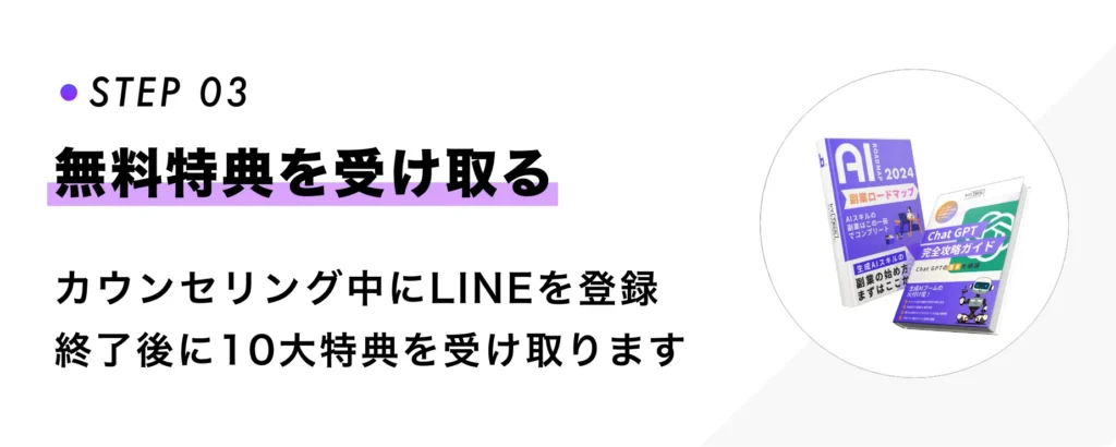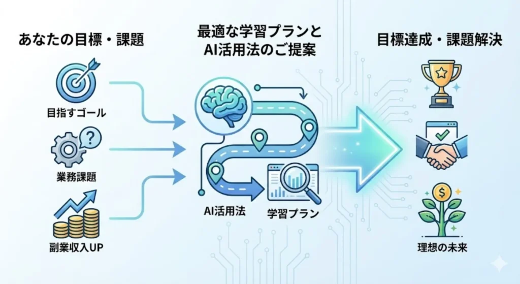 あなたが目指しているゴールや業務で解決したい課題・副業での収入UPなど目的に対して最適な学習プランとAI活用法を提案します。