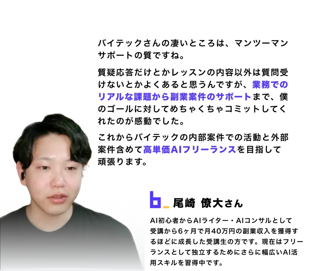 さらに収益化・業務活用まで見据えたAI活用スキル証明課題により、他スクールよりも「使えて、見える実践的な成果」を短期間で得ることが可能になっています。