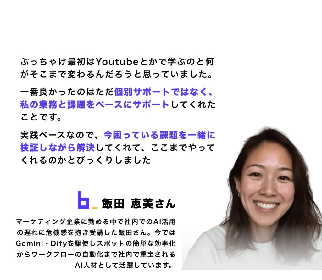 厳選されたAIメンターが学習を伴走し、目的から逆算して“現場で使えるAI活用スキル”を最短で身につけられる実践型プログラムです。