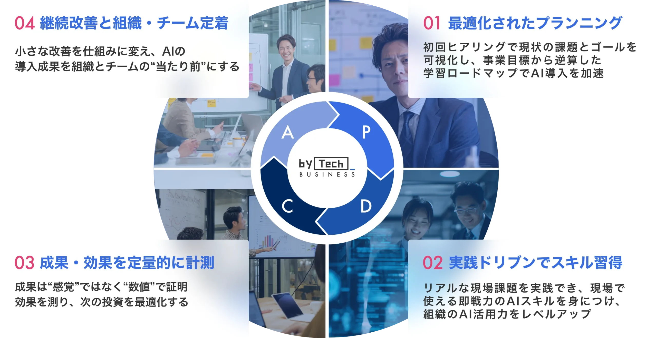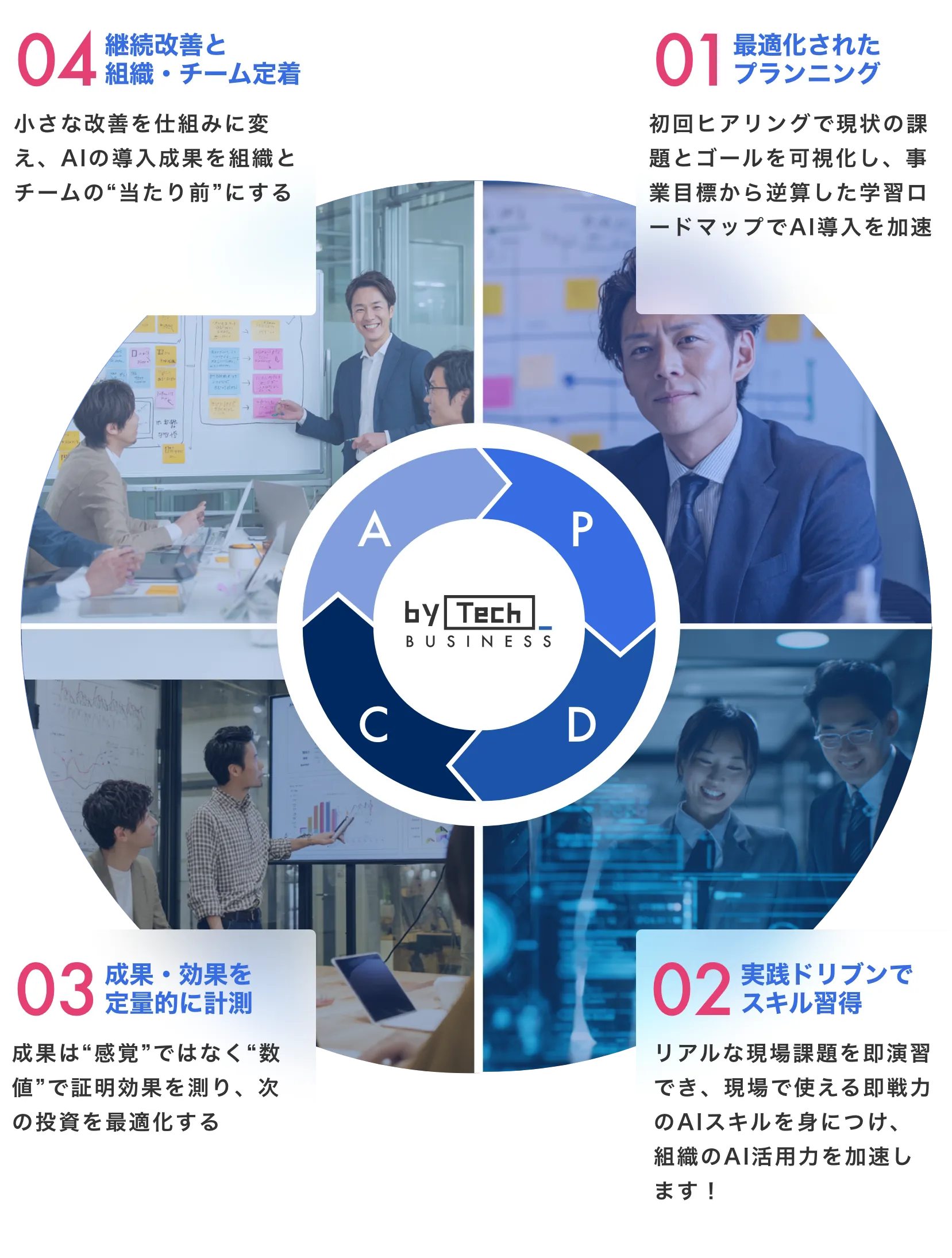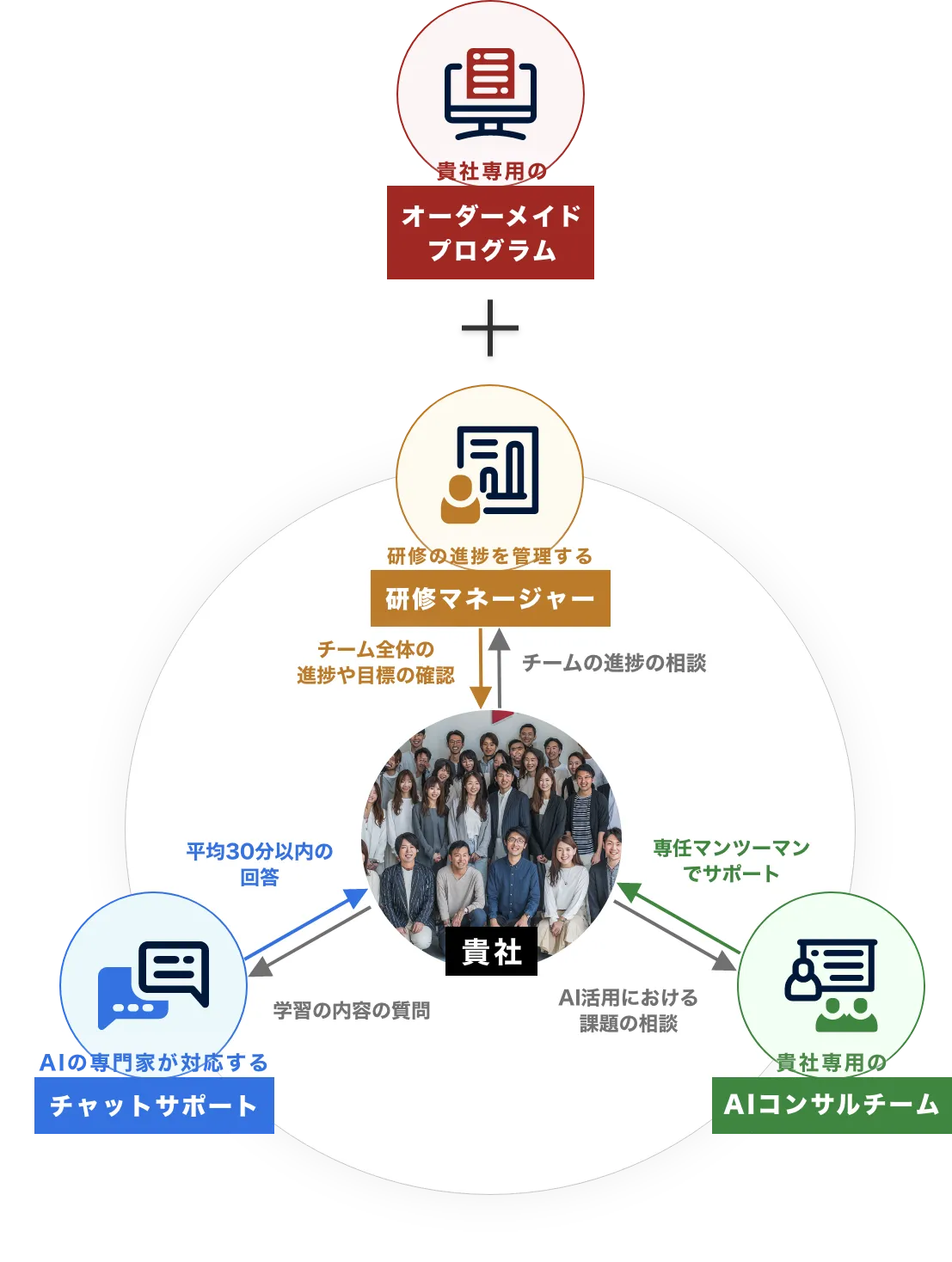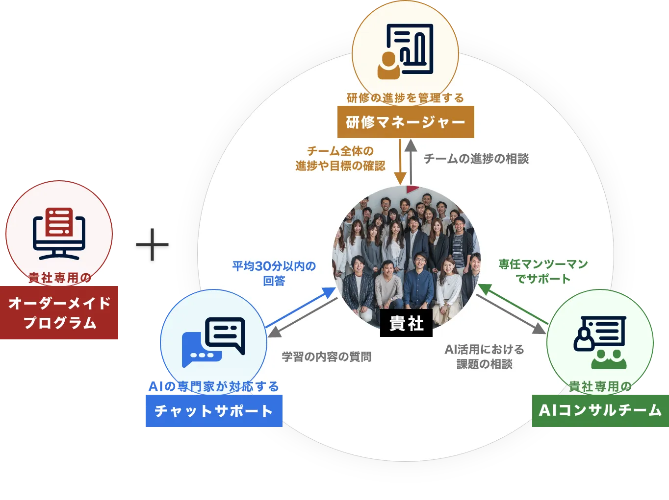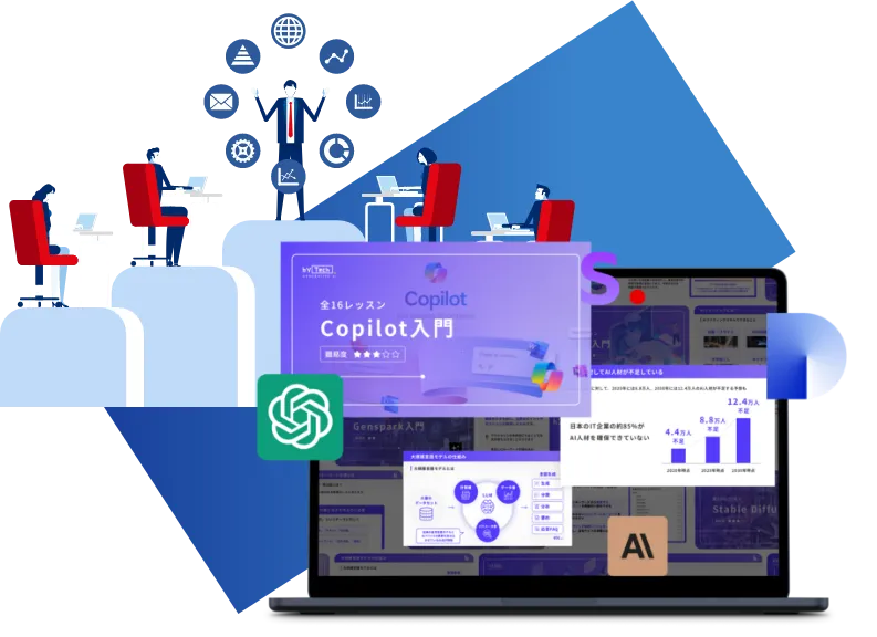 A, 組織・チームの課題やゴールに最適化したサポートチームを作る点です。 一般的な研修が概念学習に偏りがちな中、本研修は「単なる効率化ではなく、数字にインパクトを出す」に特化。 個人単位でAIスキルを上げるだけではチーム・組織単位でのAXは不可能ですので、バイテックBizなら失敗しない生成AI導入研修が可能です。